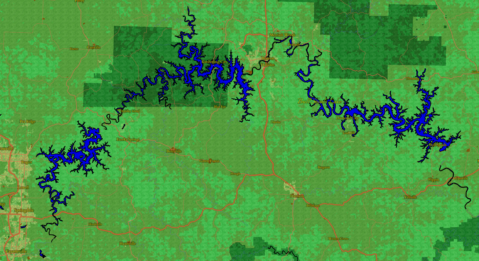 The Bull Shoals Lakes look especially striking here with that border!
