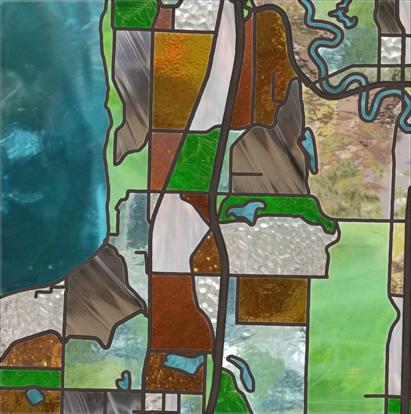 This style was inspired by a stained glass map made by Helen Tosteson and considers the organic feeling of glass in addition to the process of creating stained glass