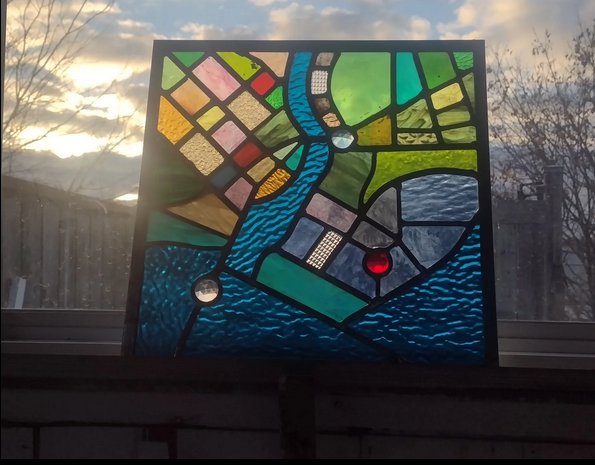 The borders of the map reflect those of stained glass in different stages. Within stained glass, black is a common color for the finished soldered borders between glass pieces. The border between water and land is a solid black to represent the more fixed separation between them. This is a flawed idea as water is a ebbing and flowing feature that is changing in location, and changing the surrounding landscape. However, this style holds the features of land and water as pieces of the environment as an ideal.