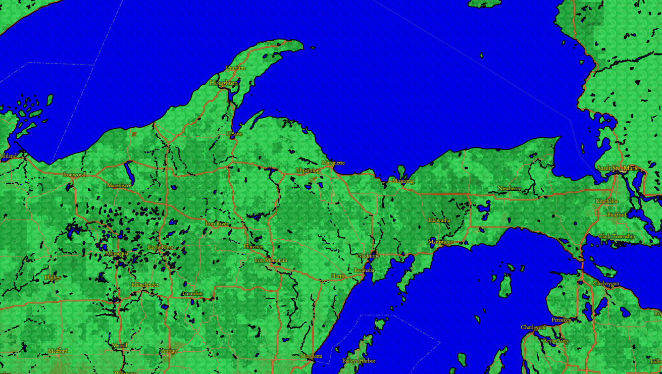 This view of the Upper Peninsula of Michigan shows the diversity of greens in the design from the different categories of land.
